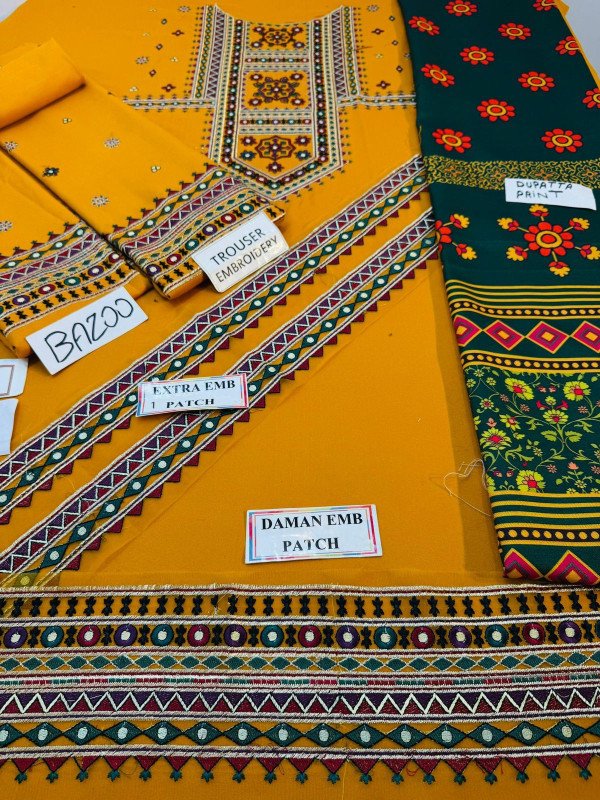 Original dhanak fabric new design three piece winter suit front fully embroidered dhanak stuff ke saath daman patch embroidery aur side chak pati embroidery included sleeves heavy embroidered trouser embroidered high quality wholesale digital printed dupatta soft warm durable fabric winter season ke liye perfect color and fabric quality hundred percent guaranteed elegant embroidery premium look ready to stitch