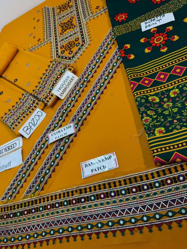 Original dhanak fabric new design three piece winter suit front fully embroidered dhanak stuff ke saath daman patch embroidery aur side chak pati embroidery included sleeves heavy embroidered trouser embroidered high quality wholesale digital printed dupatta soft warm durable fabric winter season ke liye perfect color and fabric quality hundred percent guaranteed elegant embroidery premium look ready to stitch