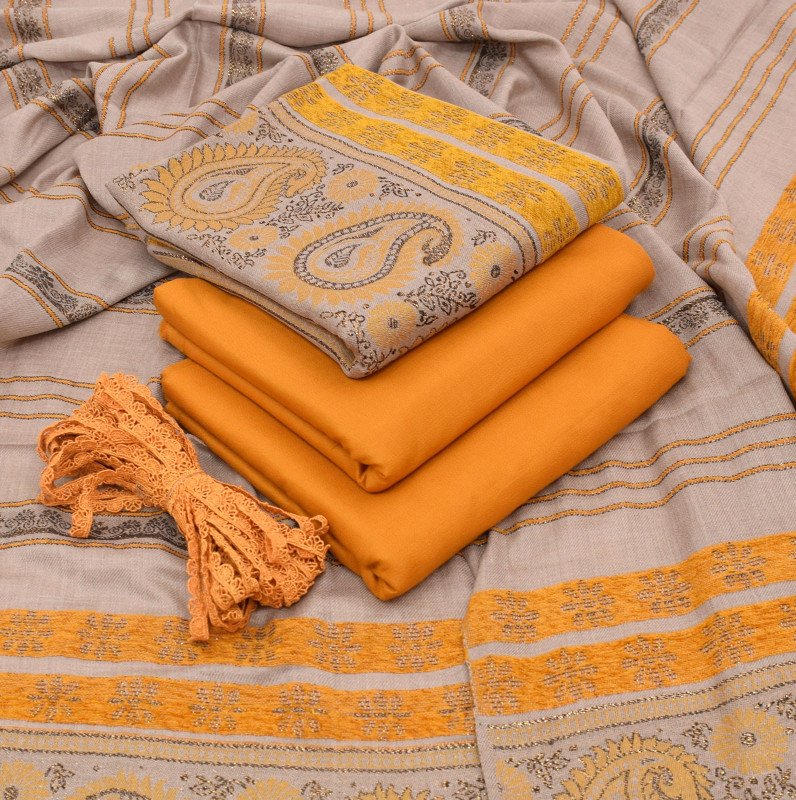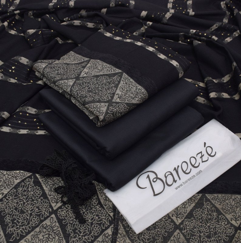 This premium 3PC Dhanak Marina Suit comes with a luxurious Velvet Jacquard Wool Shawl featuring beautiful 3D zari pati work for a truly royal winter look.